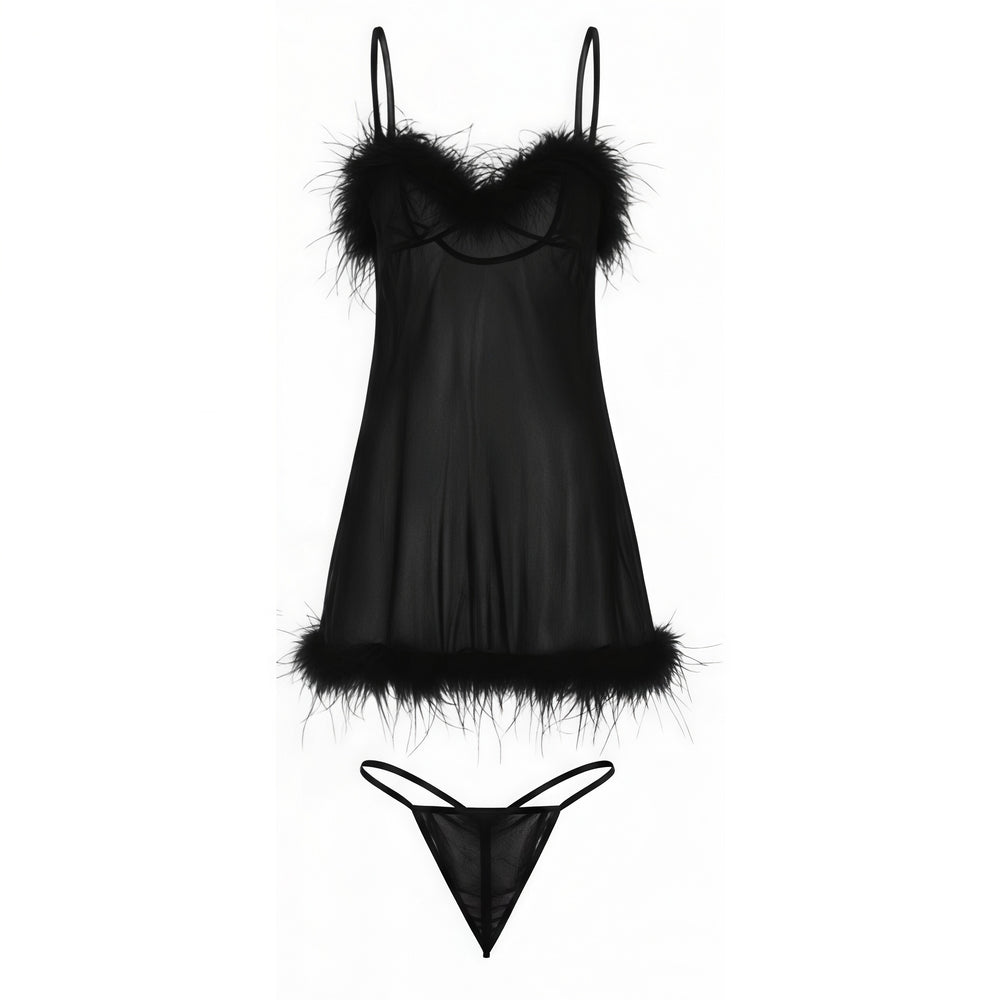 Adjustable shoulder straps allow for a comfortable, personalised fit, while feather trims along the neckline and hem add texture and subtle drama. Paired with a matching sheer G-string, this set is designed for moments that feel unhurried, personal, and deeply feminine.
